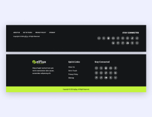 Tersedia 2 style footer yang dapat disesuaikan dengan mudah, penyusunan informasi penting seperti Tautan, Kontak, atau Hak Cipta, dengan cara yang elegan tanpa mengganggu keseluruhan estetika website.